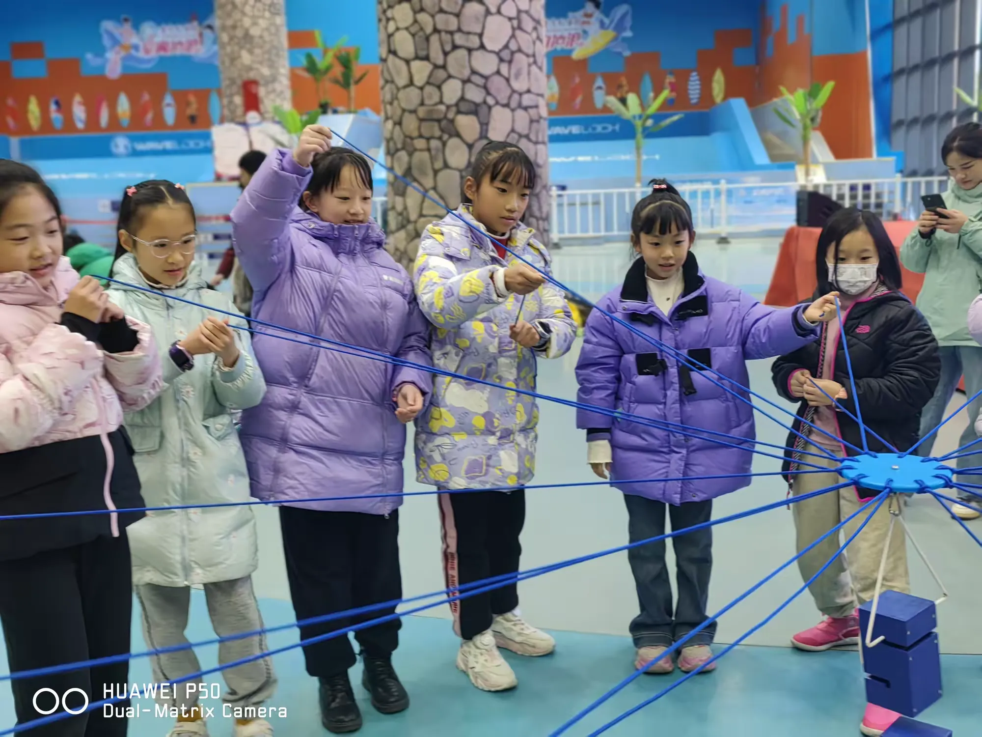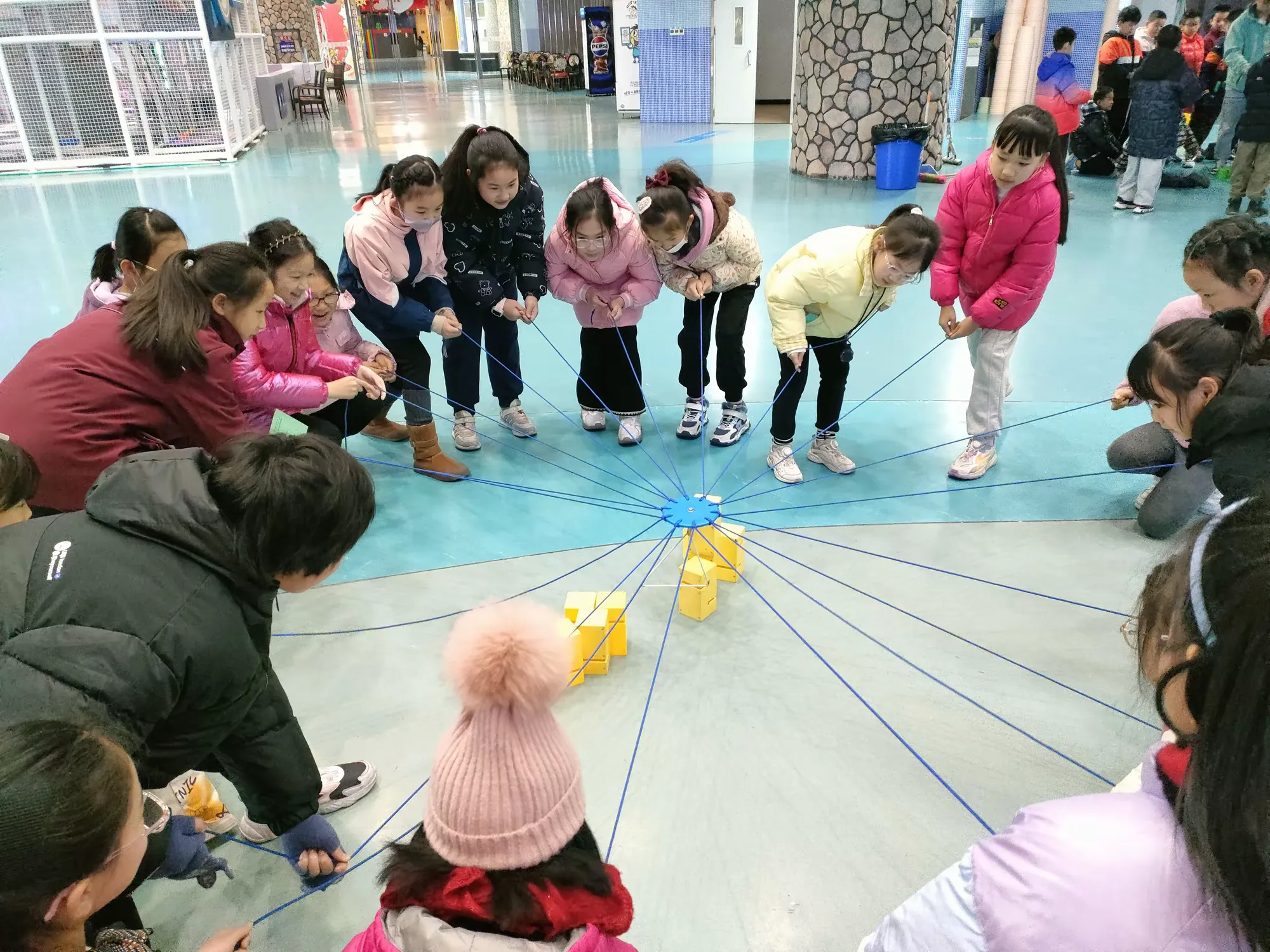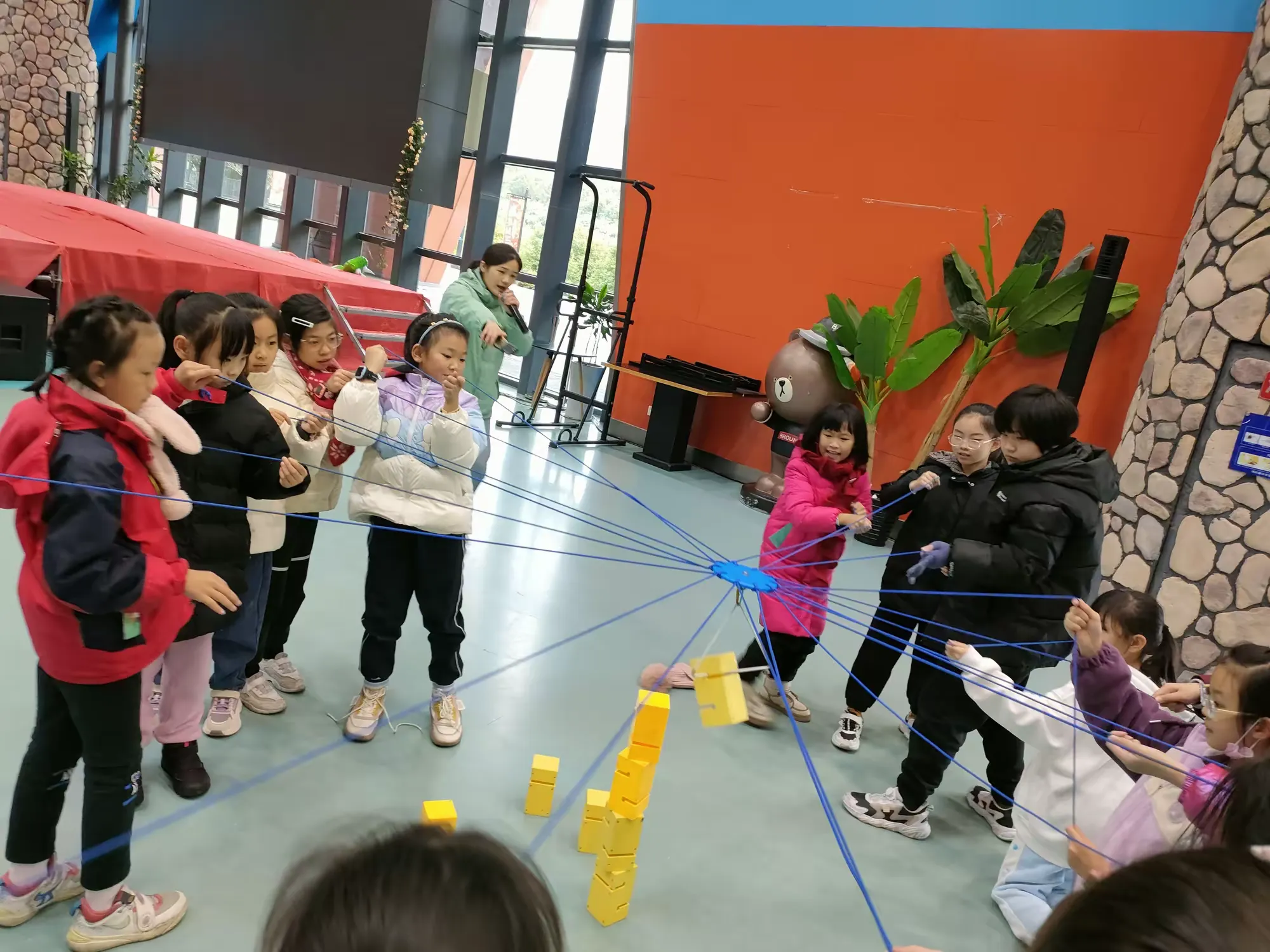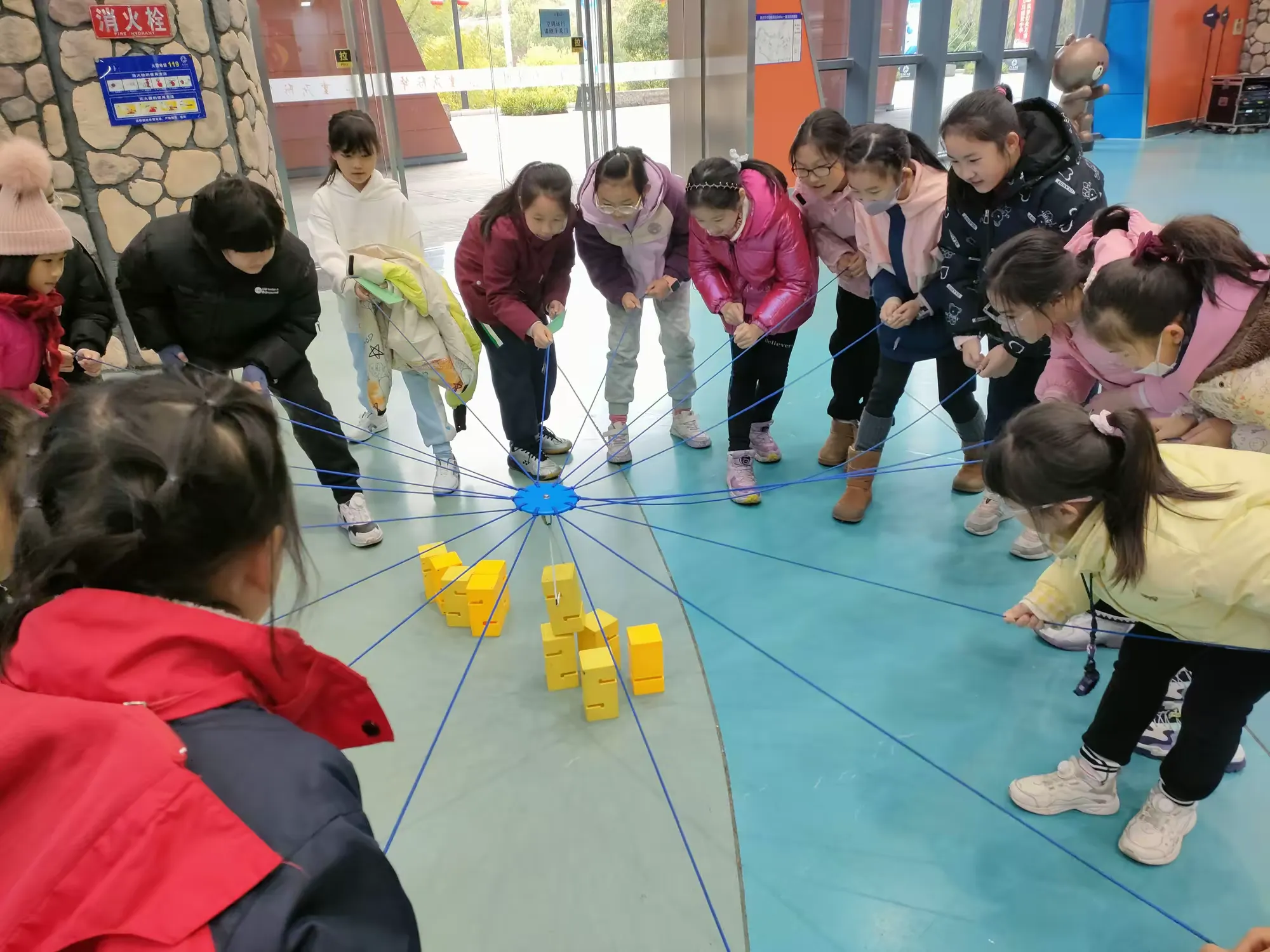 在趣味素质拓展研学课程“合力筑塔”中,同学们划分小组,通过一起拉紧绳头来控制塔钩移动,用塔钩将一块块塔块吊起并在指定地点将所有塔块摞起来。