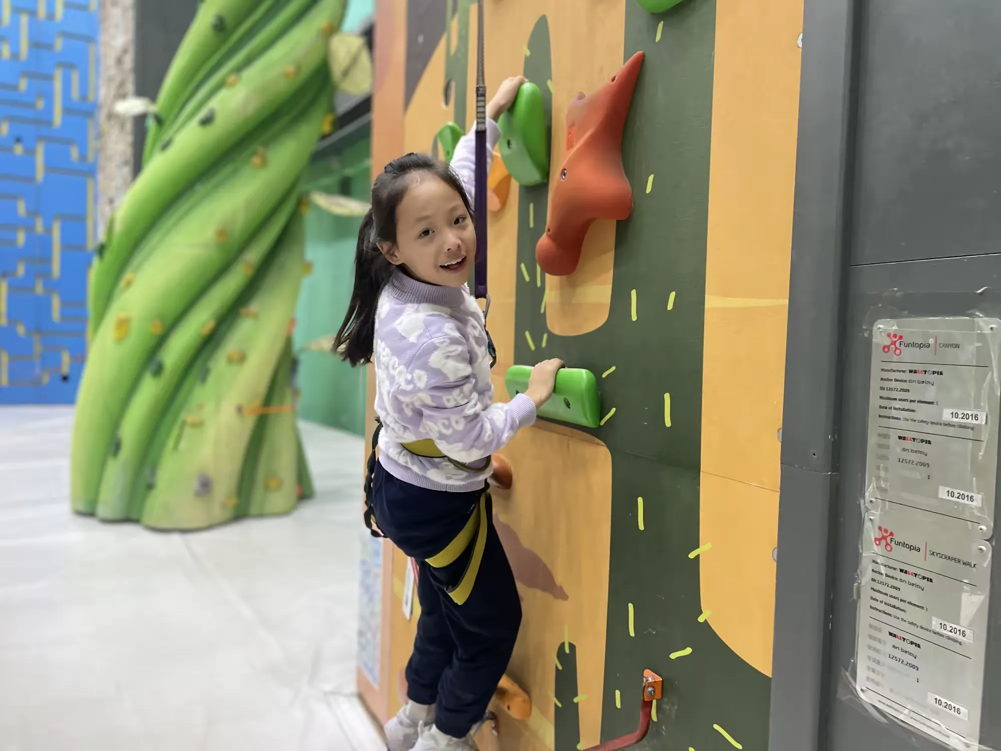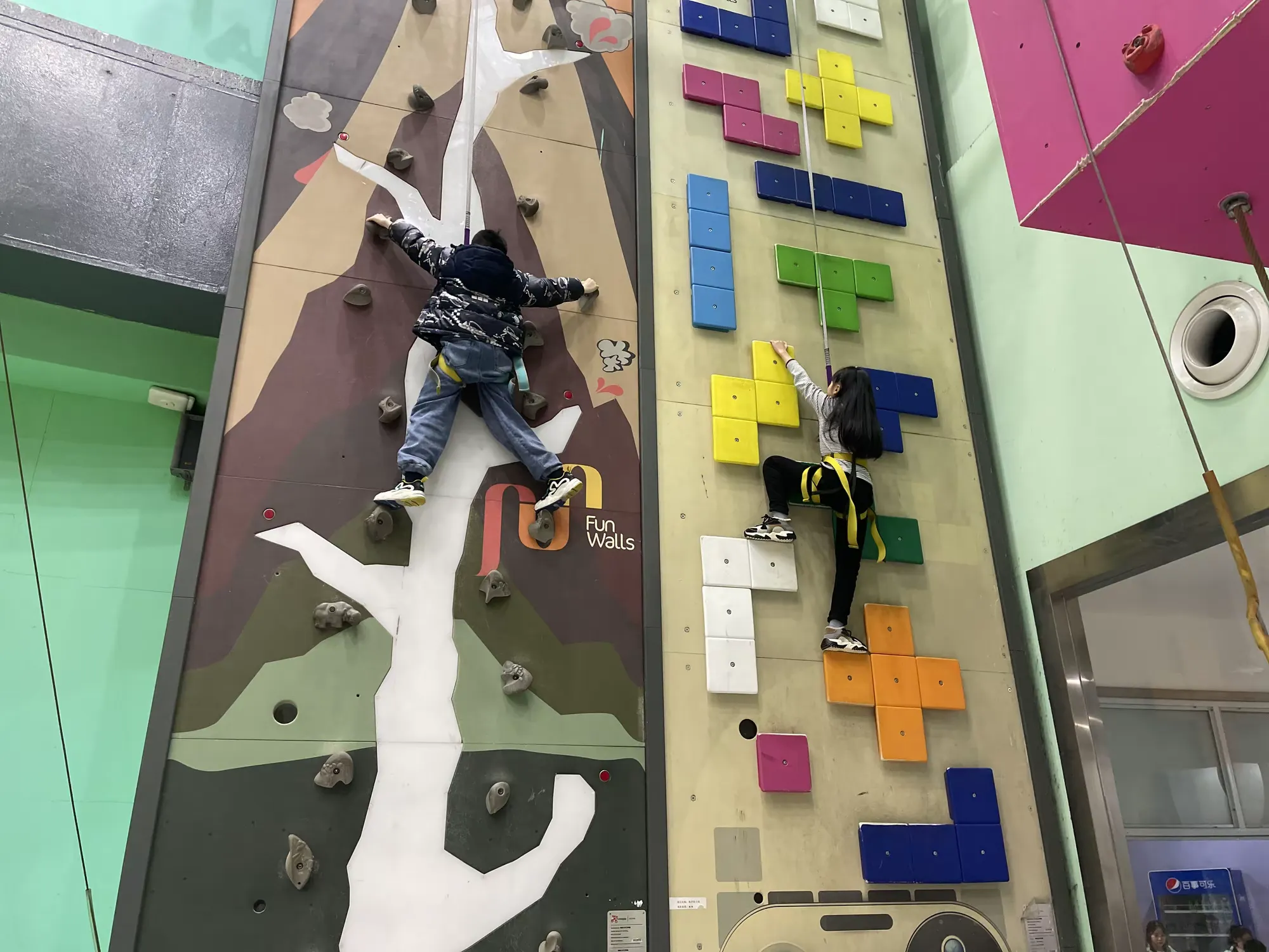 攀岩是从登山运动中衍生出来的竞技运动项目。听完专业教练讲解攀岩技巧及注意事项之后,同学们迫不及待地戴上安全绳,采用抓、握、挂等各种方法向上攀登,这是对大家体力、耐力及思考能力的考验,也是对个人勇气的提升。