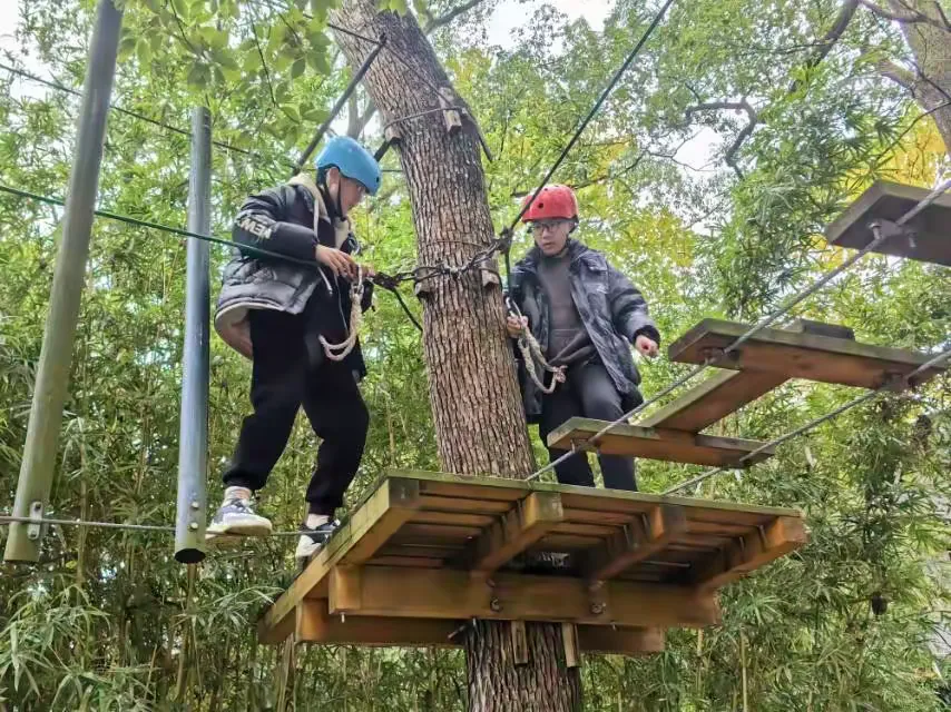 “飞越丛林”,这个高空拓展项目集运动、冒险、挑战于一体,要求参与者穿上专业的装备从起点开始进行层层闯关,到达终点完成任务。活动有趣,可别忘了安全第一。研学老师和教官认真地讲解专业设备穿戴方法,并逐一为大家检查。